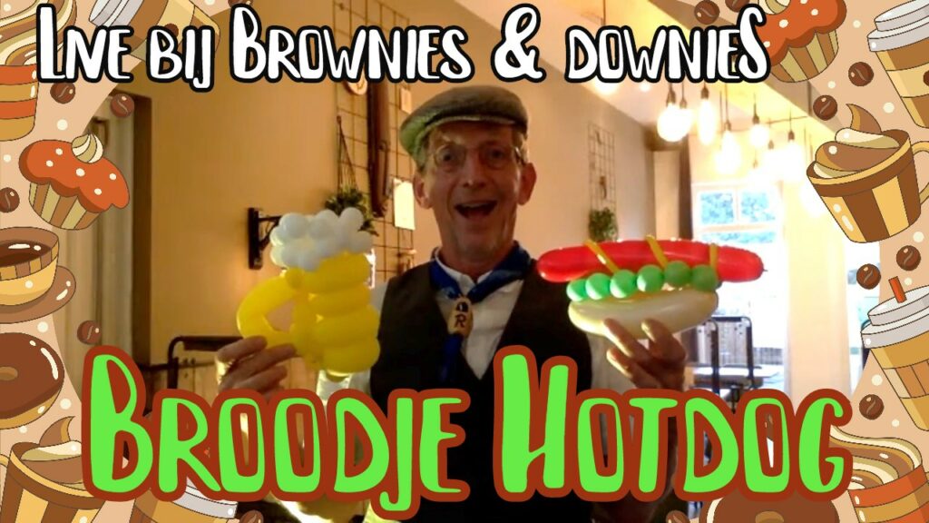 Een hotdog eten bij Brownies & downieS ? Dat kan als je de Haagse Ballonnenboer zijn gang laat gaan met zijn vouwballonnen. Live vanuit deze lokatie gaan we een hotdog maken met sla en natuurlijk de sausen daarbij. Het blijft leuk als je ziet wat je allemaal van ballonnen kunt maken. Ik laat jullie ook gelijk een aantal groenten en fruit zien die we niet gaan maken, maar die ook zelfs met ballonnen te vouwen zijn.
