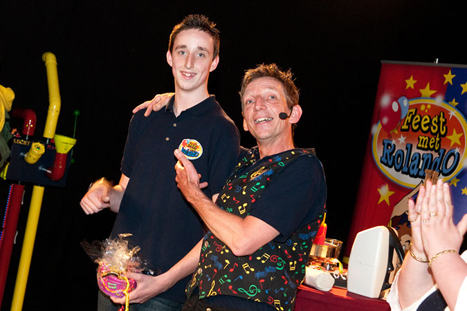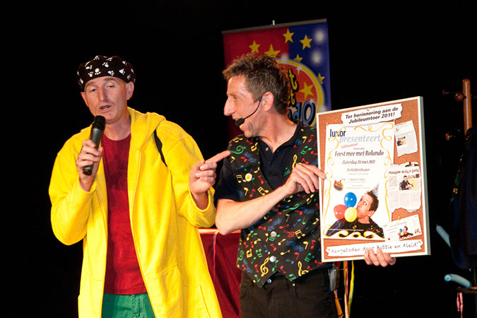 Op deze foto’s is Rolando heel trots. Zijn eerste theatershow in 2011 waar een verrassing optreden van zijn vriend en mentor Bobbie (van Ernst Bobbie en de Rest) in verwerkt zat. Na heel veel jaren van tegenslag was dit de ommekeer voor kinderartiest Rolando en wat was het gaaf, gezellig en bijzonder. Het publiek waar vrienden, familie en het belangrijkste, zijn ouders zaten, genoten met vollen teugen.